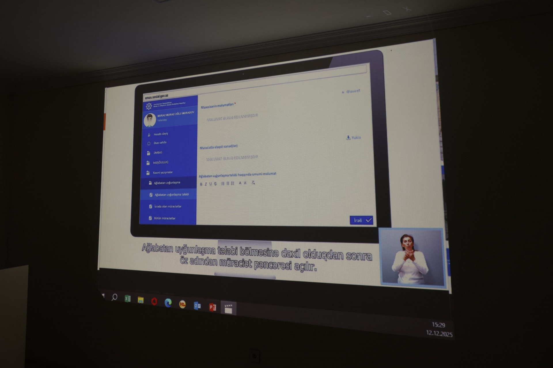 Əlilliyi olan şəxslərə ağlabatan uyğunlaşdırılma hüququndan istifadə etmək üçün müraciət qaydaları ilə bağlı təqdimat nümayiş etdirilib.