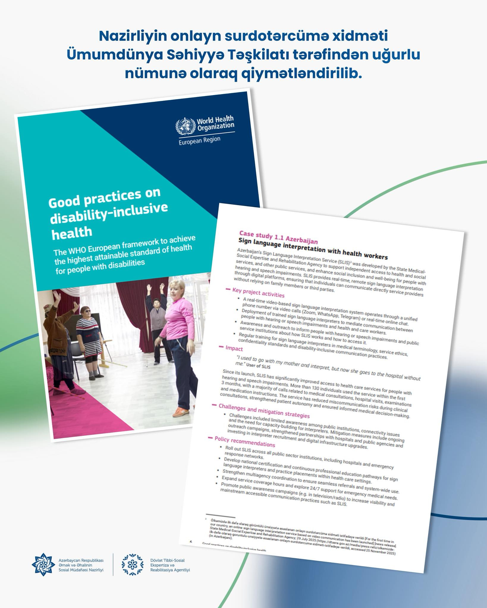 Əmək və Əhalinin Sosial Müdafiəsi Nazirliyinin tabeliyində Dövlət Tibbi-Sosial Ekspertiza və Reabilitasiya Agentliyinin "Səsiniz olaq" onlayn surdotərcümə xidməti Ümumdünya Səhiyyə Təşkilatı tərəfindən ən yaxşı təcrübə elan edilib.